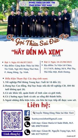 Để đón nhận những ứng viên mới, có ước nguyện trở thành tu sĩ, linh mục Dòng Thừa Sai Đức Tin, sống và làm chứng cho Đức Tin, Ban Tuyển Sinh Tỉnh Dòng Việt Nam tổ chức chương trình tìm hiểu và khám phá ơn gọi Dòng Thừa Sai Đức Tin, với những thông tin như sau: