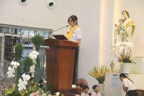Sau lời nguyện hiệp lễ, Ông chủ tịch HĐMV trình lên Đức TGM những sinh hoạt của giáo xứ trong năm qua, đồng thời cám ơn quý linh mục và  anh chị Huynh trưởng GLV đã dạy dỗ các em trong suốt thời gian qua.