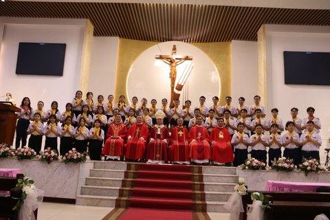 Thánh lễ kết thúc lúc 19g30. Dức TGM và quý linh mục chụp hình lưu niệm với các em vừa lãnh nhận Bí tích Thêm Sức.