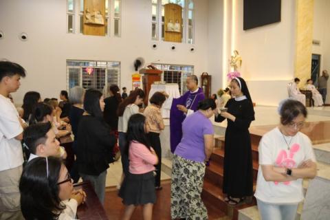 Sau bài chia sẻ, cộng đoàn lần lượt tiến lên nhận tro trên đầu. Hình ảnh từ những em thiếu nhi đến các vị cao niên cùng cúi đầu nhận tro tạo nên khung cảnh đức tin đầy cảm động. Nghi thức này như một dấu mốc, khép lại những cuộc vui ngày Tết để mỗi người bắt đầu một hành trình thiêng liêng: cầu nguyện, ăn chay và làm việc bác ái.