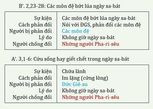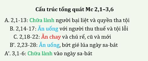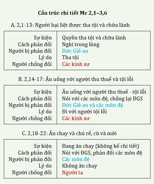 - Về cấu trúc tổng quát, đoạn văn 2,1–3,6 chia thành 5 đoạn văn và cấu trúc theo dạng đồng tâm A, B, C, B’, A’, (xem C. Focant, L’évangile selon Marc, (CB.NT 2), Paris, Le Cerf, 2004, p. 104-106):