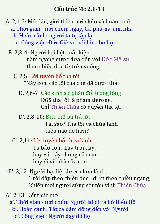 Tìm hiểu cấu trúc sẽ giúp xác định đề tài chính đoạn văn. 2,1-13 có cấu trúc đồng tâm: A, B, C, D, D’, B’, C’, A’ như sau: phần dẫn nhập (A. 2,1-2: giới thiệu nơi chốn và hoàn cảnh) và phần kết rõ ràng (A’. 12,13: thay đổi nơi chốn). Câu kết 2,13 gọi là câu kết mở vì vừa là câu chuyển tiếp, dẫn vào trình thuật Đức Giê-su kêu gọi ông Lê-vi (2,14), vừa song song với phần dẫn nhập, mô tả hoạt động của Đức Giê-su xuyên suốt Tin Mừng Mác-cô với 3 yếu tố: (a // a ’) Đức Giê-su hiện diện; (b // b’) mọi người đến với Người và (c // c’) Người giảng dạy hay “nói Lời” cho họ.