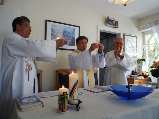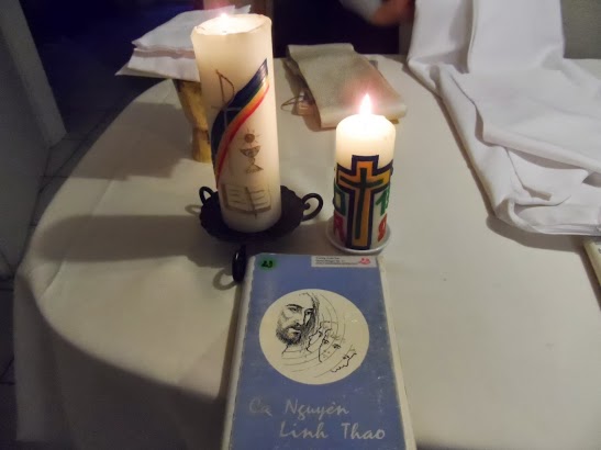 Sau khi hát thánh ca du dương thật phê rồi thì 18giờ dùng cơm chiều. 19.giờ 30 thánh lễ khai mạc ý chỉ cầu cho ĐGH. tất cả tu sỹ, ơn thiên triệu, và đặc biệt cho nhóm được thăng tiến. Cha Qúy chủ tế và cha Thế chia sẻ Lời Chúa với mọi người: Kính chào qúy cha và anh chị em, đã khá lâu rồi nay tôi mới có dịp trở về mái nhà xưa, là gia đình Inhã để họp mặt. Rất cảm động và vui mừng ngày hội lớn của chúng ta. Một vài gợi ý với gia đình Inhã. Chúng ta là những người đang sống theo linh đạo của thánh tổ Inhã để đi trên còn đường đời mình là một hành trình trở về nhà Cha của chúng ta là Thiên Chúa.