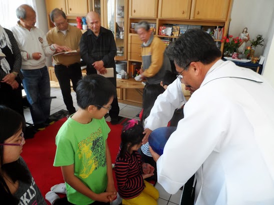 Cha Thế chủ tế. Ngài hướng dẫn 6 em thiêu nhi với 6 ly nước của mỗi em tự đổ vào một chậu đựng thật đẹp ở chính giữa có cây Thánh giá với tượng Chịu Nạn (Thánh giá này là của nhóm "Tin Yêu" Vương Quốc Bỉ tặng cho nhóm Inhã nhân dịp nhóm Inhã mừng 20 tuổi nằm vừa rồi) Sau đó ngài làm phép nước và dùng nước này lập lại nghi thức rửa tội cho mọi người, cả ba cha cũng được làm nghi thức này.
