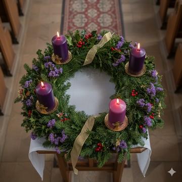 Bốn Cây Nến – Ánh sáng tăng dần của sự chờ đợi Bốn cây nến đại diện cho bốn tuần Mùa Vọng, được thắp sáng dần dần mỗi Chúa Nhật, tượng trưng cho ánh sáng Chúa Kitô xua tan bóng tối tội lỗi. Ba cây nến tím (hoặc tím than) biểu thị sự cầu nguyện, sám hối và chuẩn bị tâm hồn, vì Mùa Vọng từng được gọi là "Mùa Chay nhỏ". Màu tím gợi nhớ đến sự khiêm nhường và ăn năn, chuẩn bị cho Chúa đến lần thứ hai trong vinh quang. Cây nến hồng thứ ba, thắp vào Chúa Nhật Gaudete (nghĩa là "Hãy vui lên"), tượng trưng cho niềm vui, an ủi và hy vọng, vì Mùa Vọng đã qua nửa chặng đường và Giáng Sinh đang cận kề. Trong một số truyền thống, các nến còn mang chủ đề cụ thể: Hy Vọng (tiên tri), Hòa Bình (Bethlehem), Vui Mừng (mục đồng), và Tình Yêu (thiên thần). Một số vòng hoa thêm nến trắng thứ năm ở trung tâm, thắp vào Giáng Sinh, đại diện cho Chúa Kitô – Ánh Sáng của thế gian.