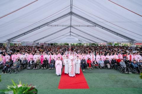 Giữa dòng người ướt mưa, hình ảnh Đức cha Phêrô Nguyễn Văn Đệ khiến tôi lặng đi. Dù tuổi cao, sức khỏe hạn chế, ngài vẫn ra tận nơi đón các đoàn, cúi xuống xoa đầu các em nhỏ khuyết tật, ánh mắt hiền hậu và nụ cười ấm áp nổi bật giữa tiết trời giá lạnh. Tôi chợt hiểu: tình yêu không cần ồn ào, chỉ cần hiện diện đúng lúc.