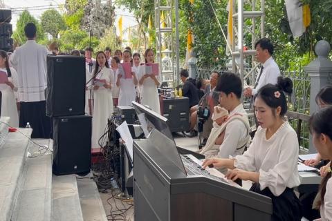 Trong đạo Công giáo, ta vẫn thường bắt gặp những hình ảnh như thế, giản dị mà thiêng liêng. Một gia đình cùng nhau phụng sự Thiên Chúa: người cha, người mẹ vừa là nhạc công, vừa là cha mẹ, vừa là người phục vụ. Và đứa con bé bỏng kia, dù chưa hiểu gì, nhưng đã vô tình trở thành một phần của bản thánh ca dâng lên Thiên Chúa, bản nhạc của yêu thương, của sự hy sinh phục vụ.